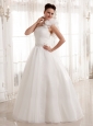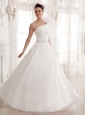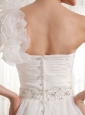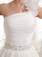 Simple yet gorgeous this white wedding dress is! This dress is entirely made from comfortable organza fabric and the fitted bodice is accented with floral one shoulder style and ruchings. The waistband which is heavily beaded defines your slim waistline and adds details to the whole design. The elegant skirt flows freely to the floor in clean lines which sways elegantly when you walk. You will be the real princess on your big day.