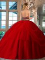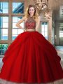 Lovely Red Tulle Backless Halter Top Sleeveless Floor Length Sweet 16 Dress Beading