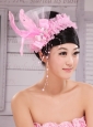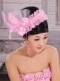 Lovely Rose Pink Imitation Pearls and Feather Decorate Tulle Headpieces For Cocktail