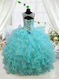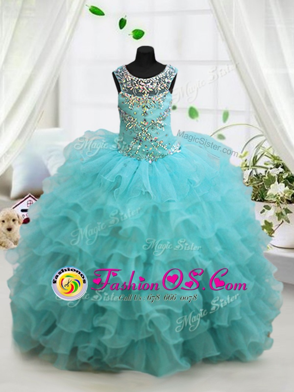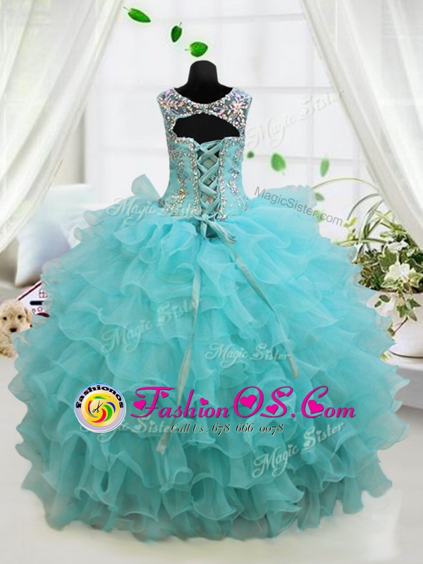 Lovely Ruffled Floor Length Aqua Blue Pageant Gowns For Girls Scoop Sleeveless Lace Up