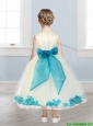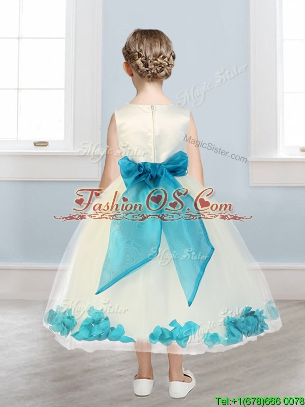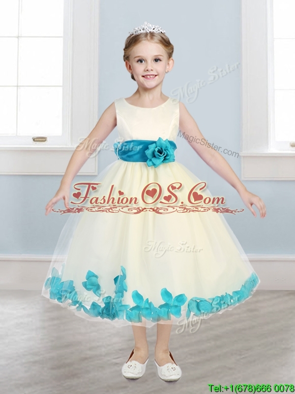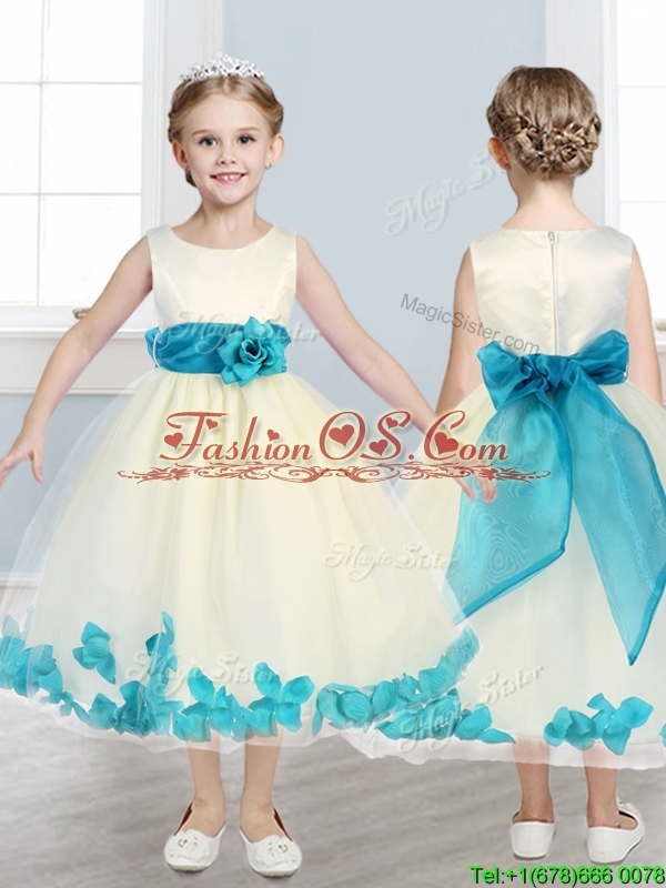 Lovely Scoop Little Girl Pageant Dress with Teal Hand Made Flowers