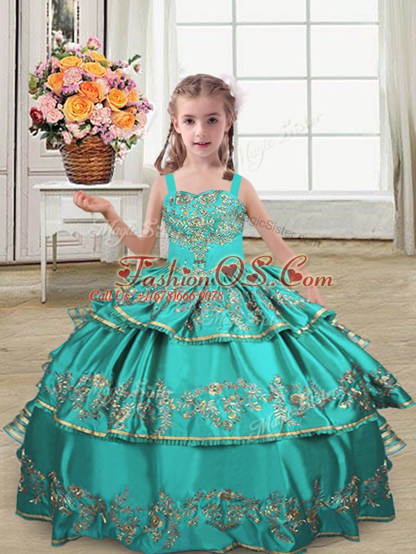Home >  Special Occasion Dresses >  Pretty Little Girl Pageant Dresses > Lovely Turquoise Lace Up Little Girl Pageant Dress Embroidery and Ruffled Layers Sleeveless Floor Length