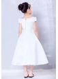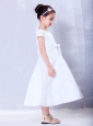 Lovely White A-line Scoop Beading and Bow Flower Girl Dress Tea-length Taffeta