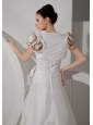This beautiful, yet understated wedding gown features a unique two tone flowers, you are sure to love it! The strapless bodice boasts a subtle sweetheart neckline. Below the ruched bust, horizontal ruchings have an slim impact. Two tone flowers adorn the hip bone area thatblend gorgeously with the one on the matching jacket. The A-line skirt is sewn to look like it's gathered all the way around and the sweeping train trails elegantly behind.