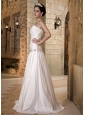 A simple A-line style, gorgeous and chic. The sweetheart style is so classic that would never go out of style! The whole bodice is heavily ruched. A band composed by clear beading is employed at the hip to create a dropped waist. The skirt falls freely in clear line to the floor. And a hidden zipper up back secures the dress in place.