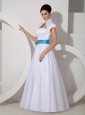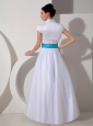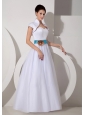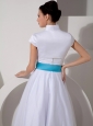 Dazzle everyone in this simple yet elegant pure style gown. Classic body-shaped bodice embellished with a contrasting waistband with a contrasting flower on accents your fabulous curves and scalloped layers of tulle fabric on skirt encrusted with clean lines and folds give the floor skimming skirt an unforgettable appeal. The back completes with a exquisite zipper up closure. A matching jacket with short sleeves and charming collar will get a gorgeous feeling when you put it on.