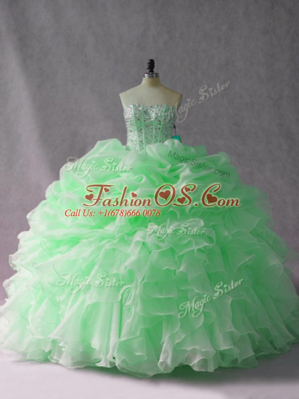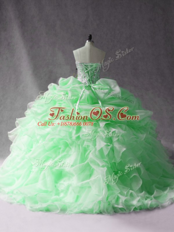 Low Price Apple Green Ball Gowns Strapless Sleeveless Organza Brush Train Lace Up Beading and Ruffles Quinceanera Gowns