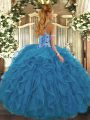 Low Price Blue Ball Gowns Organza Halter Top Sleeveless Beading and Embroidery and Ruffles Floor Length Lace Up Sweet 16 Dress