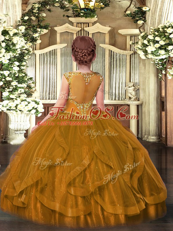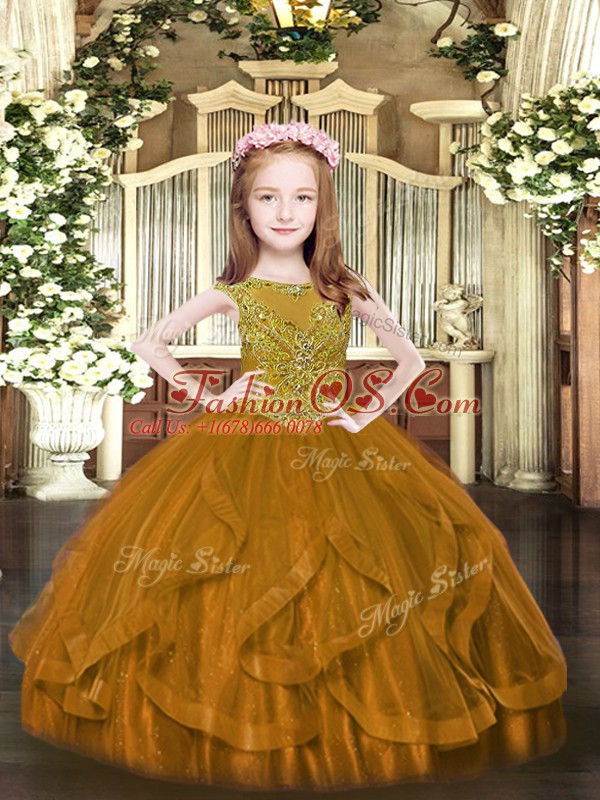 Home >  Special Occasion Dresses >  Lovely Little Girl Pageant Dresses > Low Price Brown Tulle Zipper Scoop Sleeveless Floor Length Little Girls Pageant Dress Beading and Ruffles