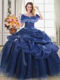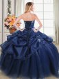 Low Price Floor Length Navy Blue Quince Ball Gowns Organza Sleeveless Beading and Pick Ups