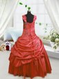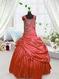 Home >  Special Occasion Dresses >  New Style Little Girl Pageant Dresses > Low Price Floor Length Watermelon Red Little Girl Pageant Dress Satin Sleeveless Beading and Pick Ups