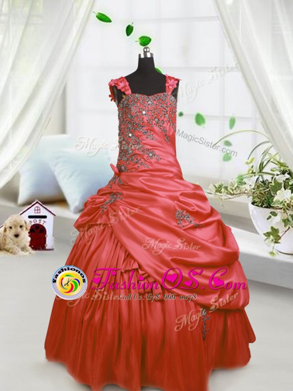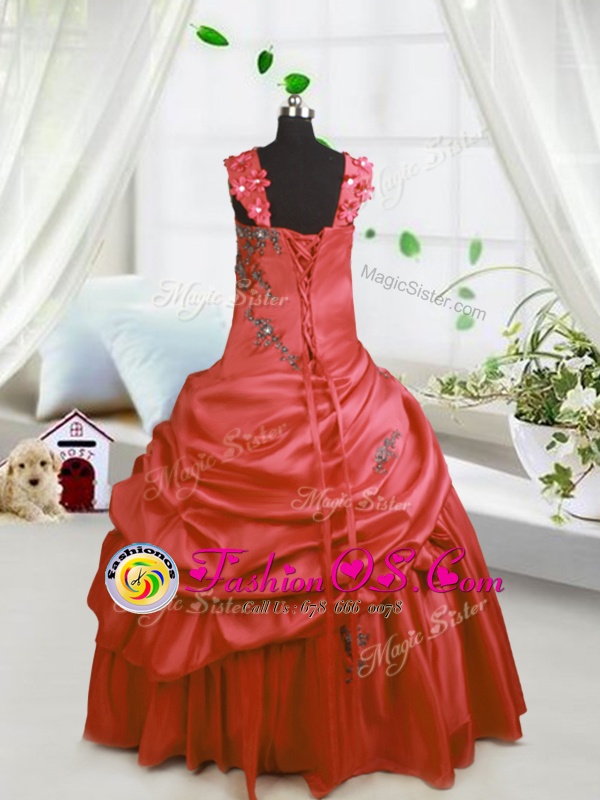 Low Price Floor Length Watermelon Red Little Girl Pageant Dress Satin Sleeveless Beading and Pick Ups