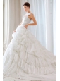 A classic silhouette and chic cascading tiered layers imbue this wedding gown with effortless detailed flair and femininity. The sparkling appliques with beads decorated on the strips and the bodice adds glitzy allure to this extraordinary look. The floral straps add the lovely and delicate effect of the dress. The gown forms a pretty overskirt of ruffles over this full ball gown skirt,which makes the dress looks bigger and graceful.A lace up back close the effect.