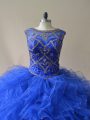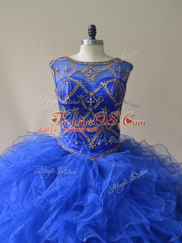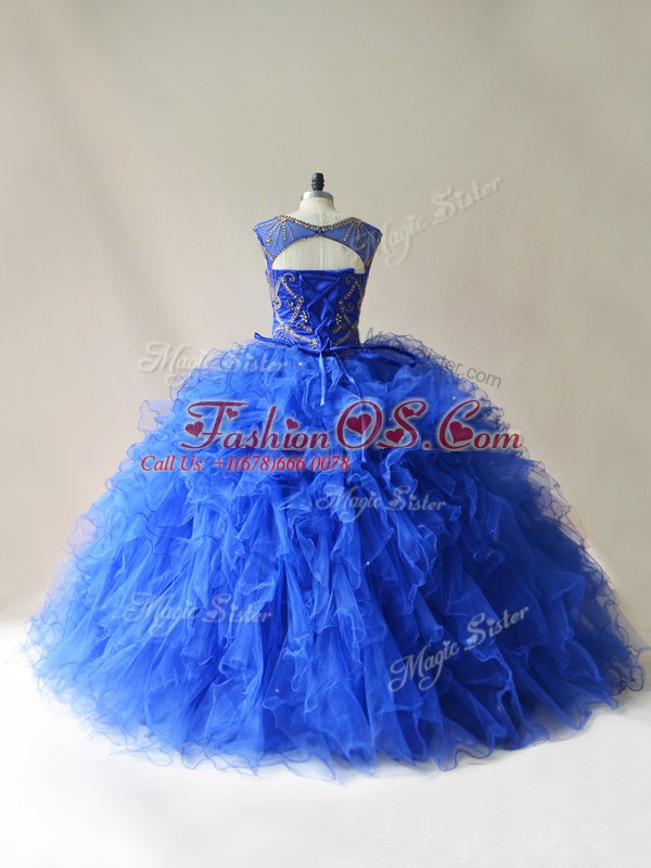 Low Price Royal Blue Scoop Neckline Beading and Ruffles 15th Birthday Dress Sleeveless Lace Up