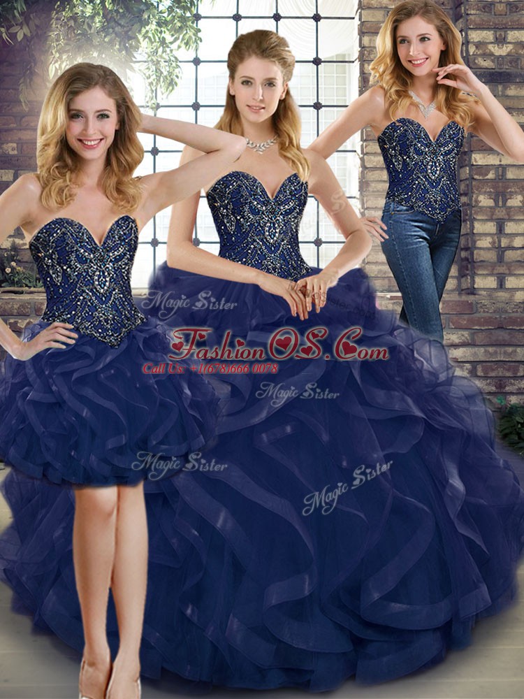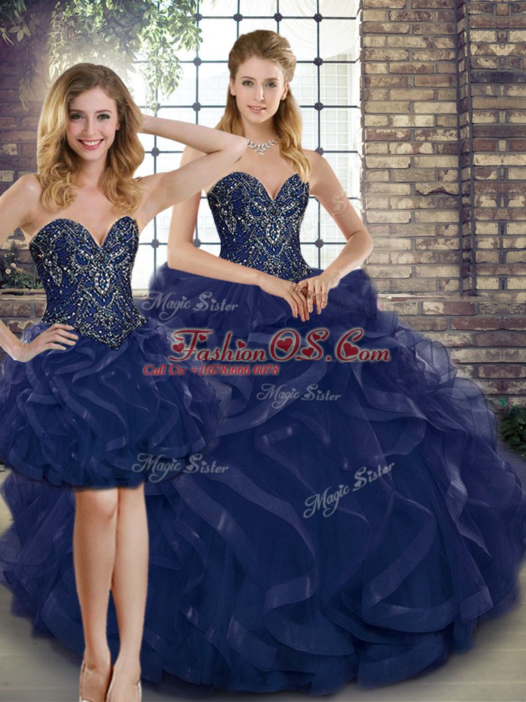 Low Price Sleeveless Floor Length Beading and Ruffles Lace Up Quinceanera Gown with Navy Blue