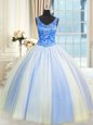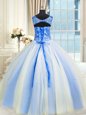 Home >  Quinceanera Dresses >  Luxurious Quinceanera Dresses > Low Price Sleeveless Tulle Floor Length Lace Up Quinceanera Gown in Blue And White for with Beading and Sequins