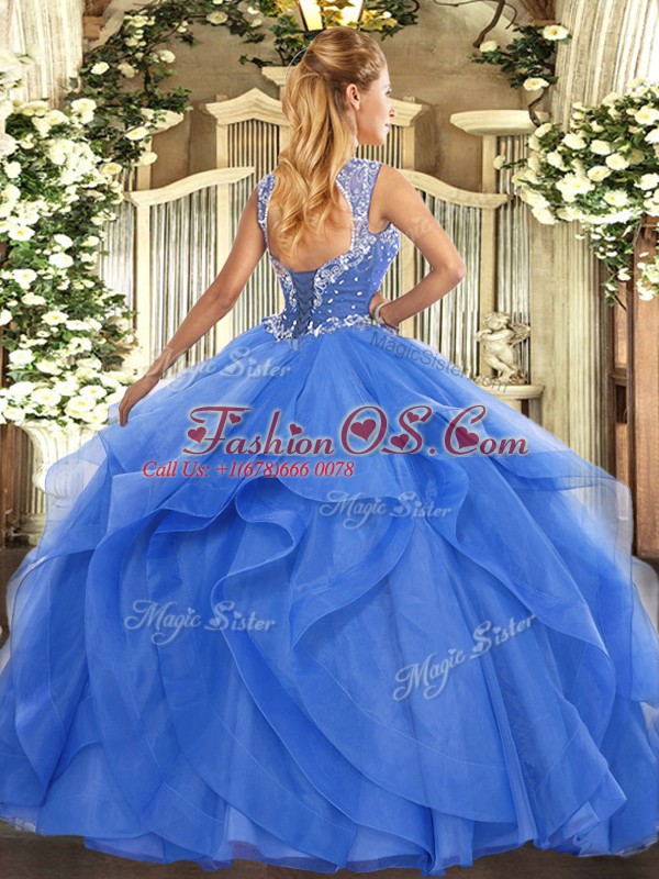 Low Price Turquoise Ball Gowns Beading and Ruffles Quinceanera Dress Lace Up Tulle Sleeveless Floor Length