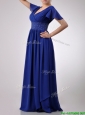 Low Price V Neck Beaded Blue Long Mother of the Bride Dress with Short Sleeves