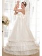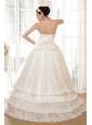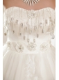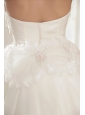 You will be clinging to this luxurious white wedding dress when you see it! The fitted pleated bodice is comprised of hand-made lovely flowers and glittering beading hung, which creat a exquisite effect. The A-line floor length skirt has many tiers of tulle fabric hemmed with lace. The back features a hidden zipper and a refined bowknot. Such a god' creation, do not hesitate any more!
