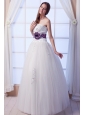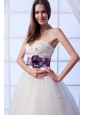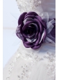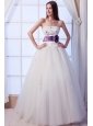 You'll be glowing in this glamorous bridal gown dress. Baroque-style beadwork glimmers at the strapless neckline and form-fitting bodice for a richly embellished elegance. A dropped, Basque waistline with a flowered purple band lengthens the torso and slenderizes hips. The layered, tutu-type skirt flares with feathery grace to an expansive full-length finishment.