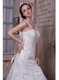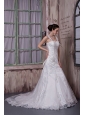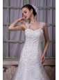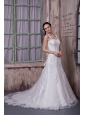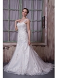 A stunning wedding dress for your important day when you really want to 'wow' the crowd! The lace straps and modified sweetheart will highlight your bodice. The lace applique with shining beading throughout the bodice stands out your figure for accent. The A-line skirt has a lace overlay attached a court train to creat a fatanstic effect. The trim of the corset style closure in the back completes the entire look. People will gaspe and jaws will drop when you walk through the doors in this beautiful wedding dress!