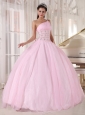 Luxurious Baby Pink Quinceanera Dress One Shoulder Organza Beading Ball Gown