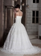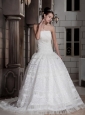 Luxurious Ball Gown Strapless Court Train Satin and Organza Voile Lace Wedding Dress