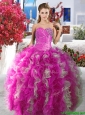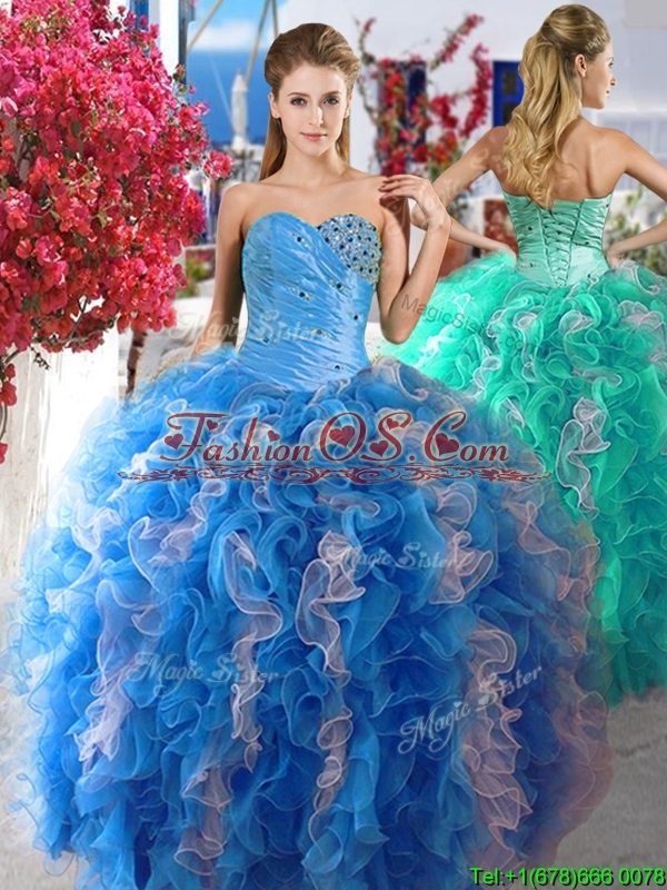 Luxurious Beaded and Ruffled Organza Quinceanera Dress in Blue and White