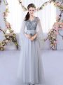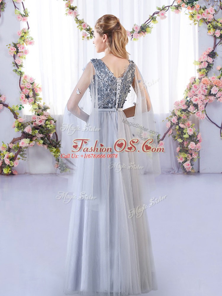 Luxurious Grey Empire Tulle V-neck Sleeveless Appliques Floor Length Lace Up Quinceanera Dama Dress