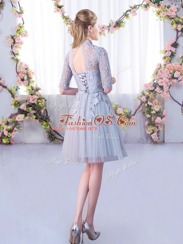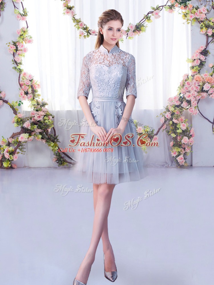 Luxurious Grey High-neck Neckline Lace Court Dresses for Sweet 16 Half Sleeves Lace Up
