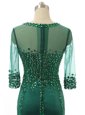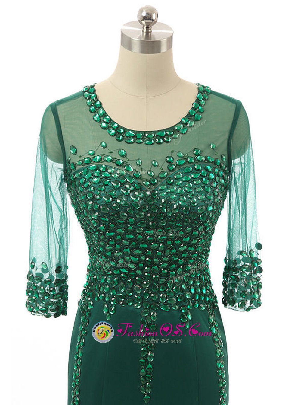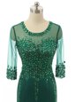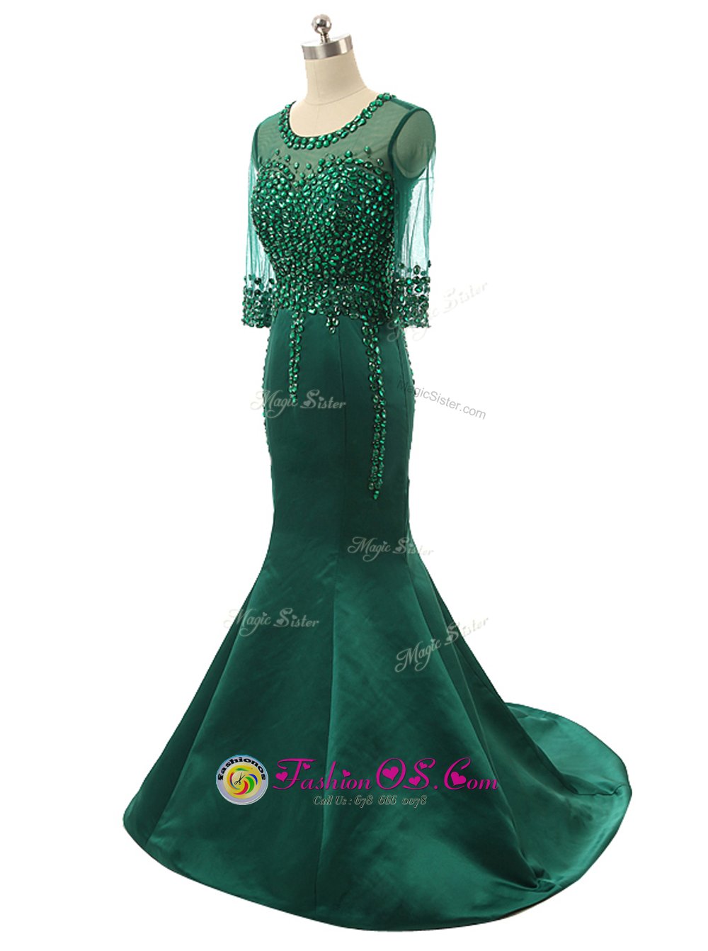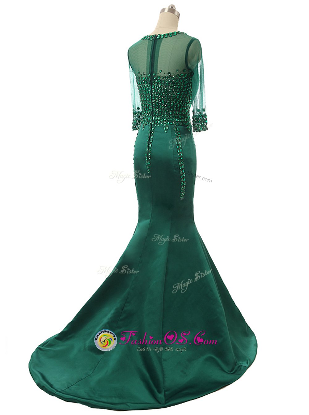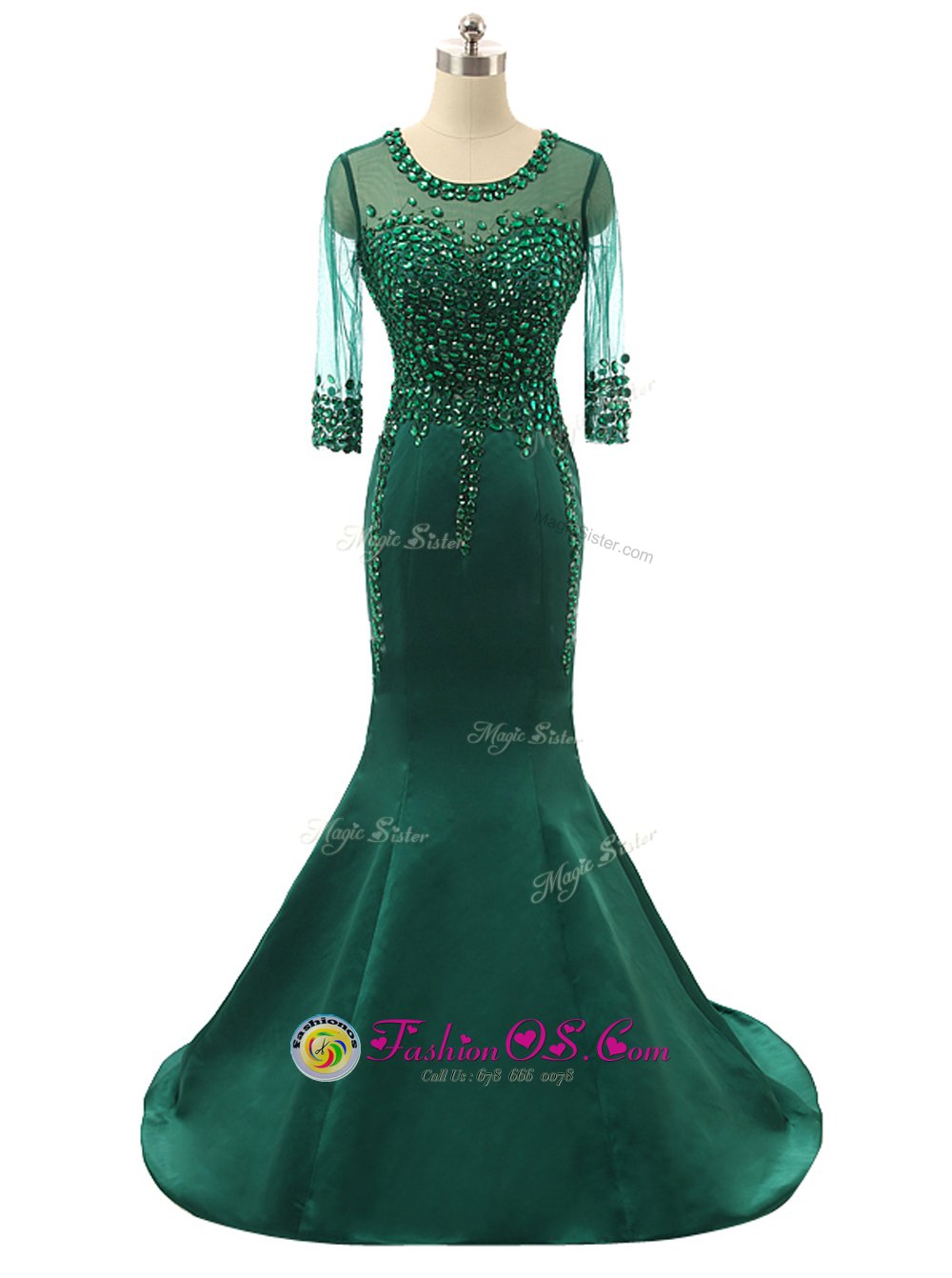 Luxurious Mermaid Satin Scoop 3|4 Length Sleeve Brush Train Zipper Beading Celebrity Evening Dresses in Green