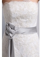 Feel special on your special day in this wedding dress. This strapless gown has a structured bust and an empire waist highlighted with floral waistband. The contrasting ribbon wraps the waist and a lovely hand-made flower sits at one side. Lace overlay covers the gown for a look that’s rich in texture. Futher more, this gown has a mermaid silhouette with a major flare through the skirt, completing with an elegant train sweeping in the back. The gown has a fit and flared shape for a delicate look that will make your guests remember the occasion.