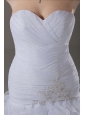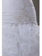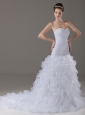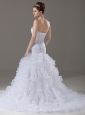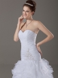 If there is a kind of fabric that ever girl want to wear, then it must be organza. Light ,dreamful and comfortable organza is always the favorites of the designers to make dresses. This fabulous wedding dress features a bandage-like bodice that hugs your curves and has a sweetheart neckline and pretty ruffled accents the bottom of the dress. A beaded floral applique accents the midsection of the dress, adding lots of interest and detail to the design. The mermaid-style skirt flares slightly at the hips. It's made entirely of ruffles that add so much fullness and beauty to the design. A corset-style closure completes the look and secures the dress in place.