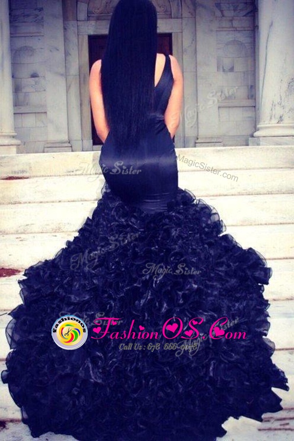 Luxurious Mermaid V-neck Sleeveless Satin Runway Inspired Dress Ruffles Sweep Train Zipper