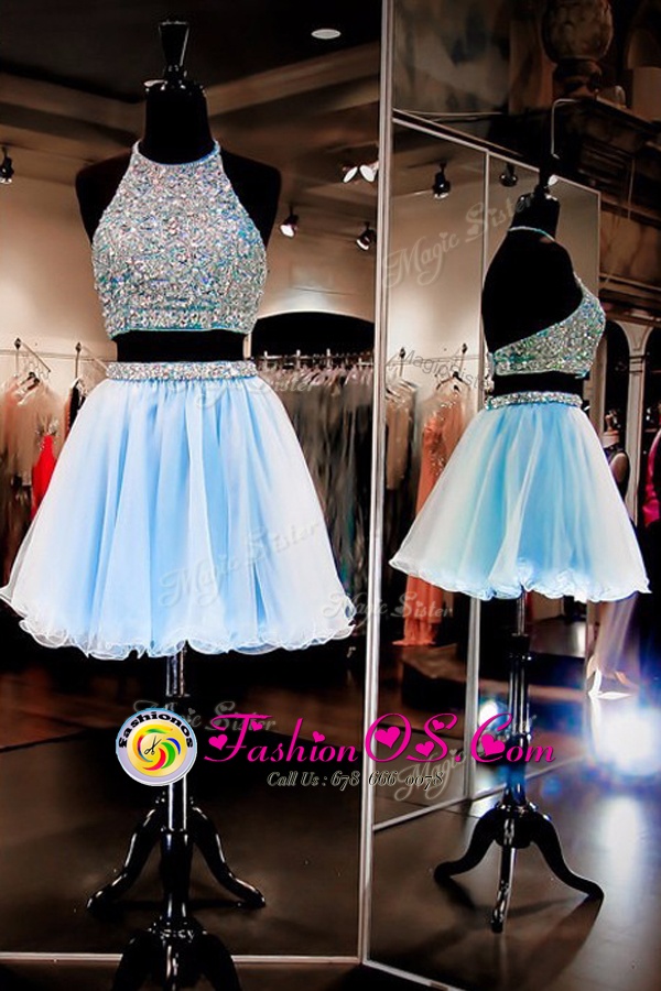 Luxurious Mini Length Light Blue Dress for Prom Halter Top Sleeveless Backless
