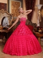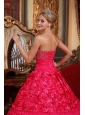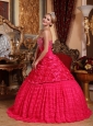 This red quinceanera gown will surely turn head. It features an elegant strapless neckline with colorful beading accented on the bust. A sash is employed to accent your waist. Fabulous rose pattern creates a sense of romance. Embroideried lace skirt falls freely to complete the look. A sweet and perfect dress for any special occasion.