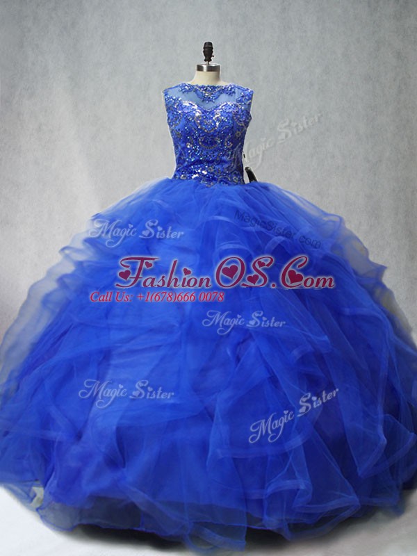 Home >  Quinceanera Dresses >  Fast Delivery Quinceanera Dresses > Luxurious Royal Blue Ball Gowns Scoop Sleeveless Tulle Brush Train Lace Up Beading and Ruffles 15 Quinceanera Dress
