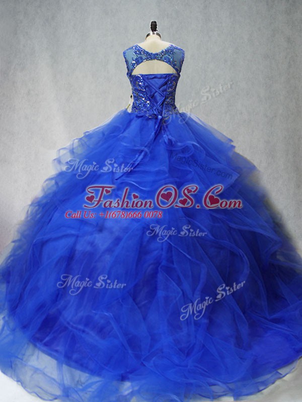 Luxurious Royal Blue Ball Gowns Scoop Sleeveless Tulle Brush Train Lace Up Beading and Ruffles 15 Quinceanera Dress