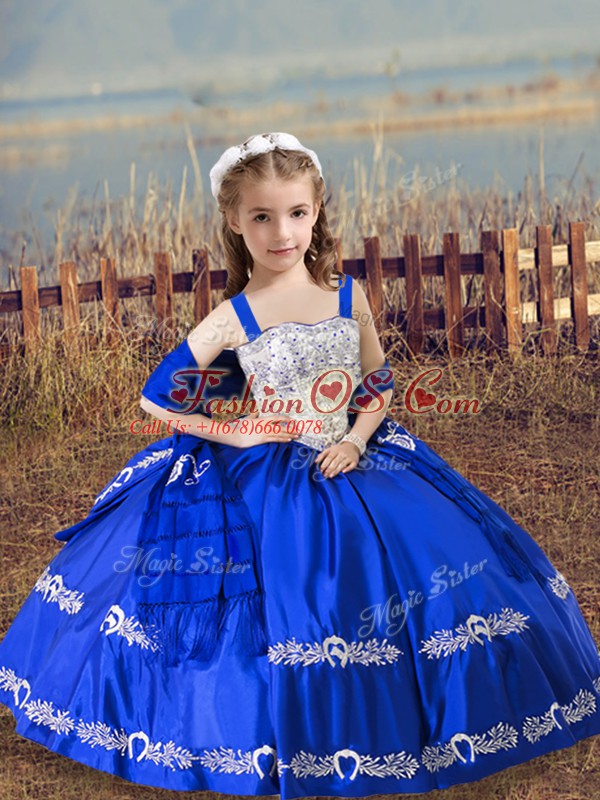 Home >  Special Occasion Dresses >  2019 Little Girl Pageant Dresses > Luxurious Royal Blue Satin Lace Up Straps Sleeveless Floor Length Little Girl Pageant Gowns Beading and Embroidery