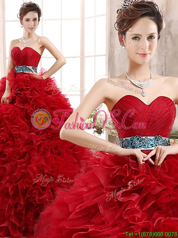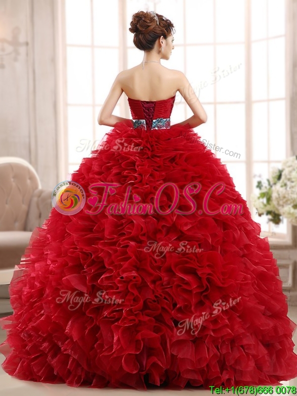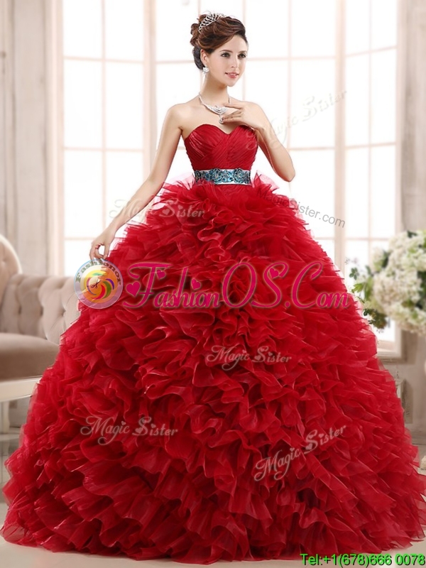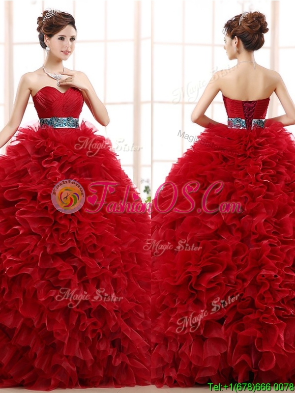 Luxurious Sashed and Ruffled Sweet 16 Dress in Wine Red