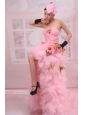 The bodice accented by ruchings and handflowers flatters most figures.It truly is an example of high end couture fashion.The skirt is asymmetrical and winding series of ruffles that begins at the hips and envelopes the legs in luxurious tulle all the way to the floor. You are sure to be charming and fabulous at your very special day. You are sure to land on everyone's best dress list.
