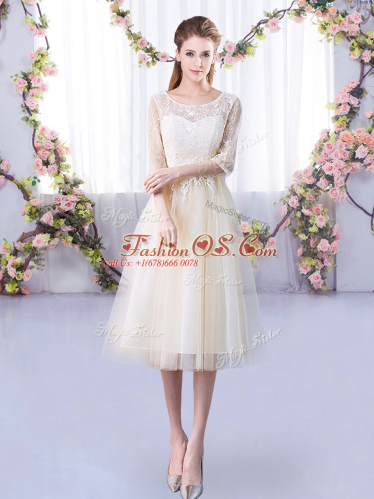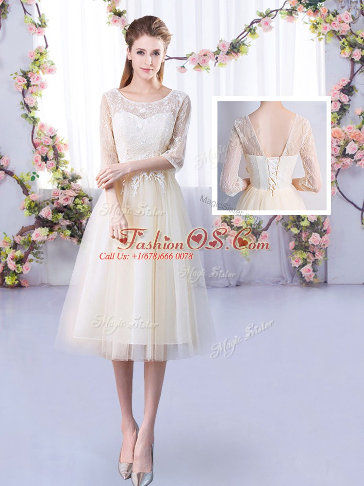 Luxurious Tea Length Champagne Vestidos de Damas Tulle Half Sleeves Lace
