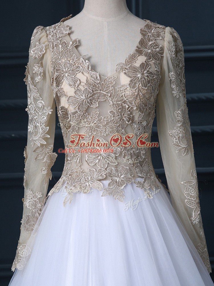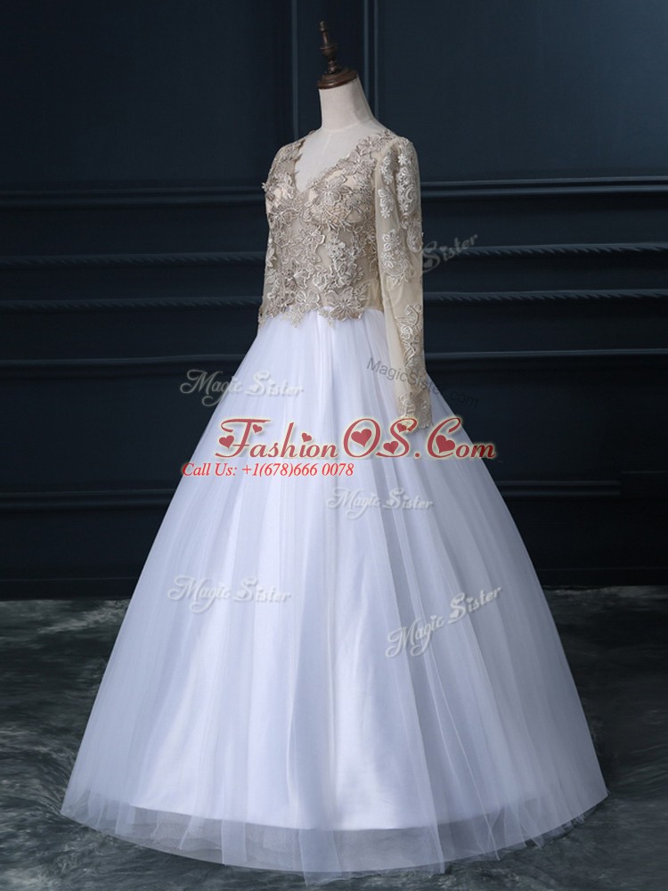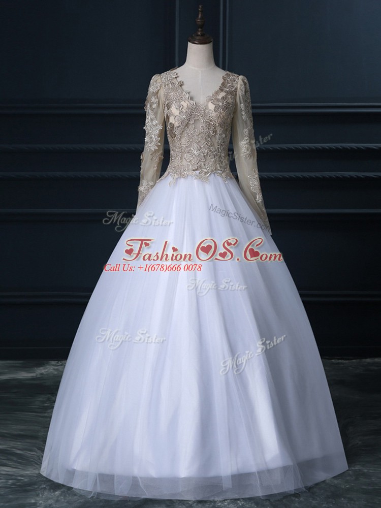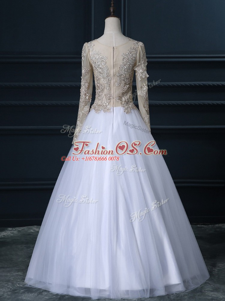 Luxurious White Ball Gowns Lace Wedding Dress Zipper Tulle Long Sleeves Floor Length