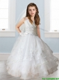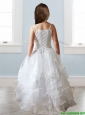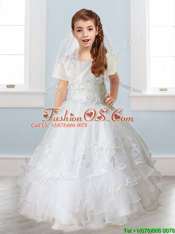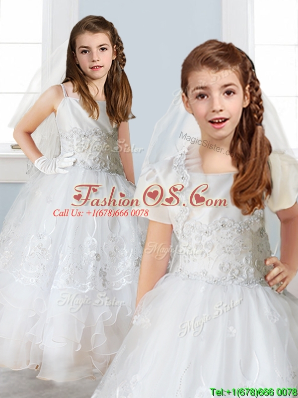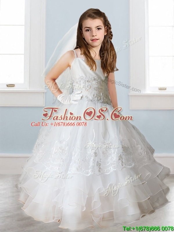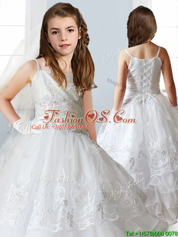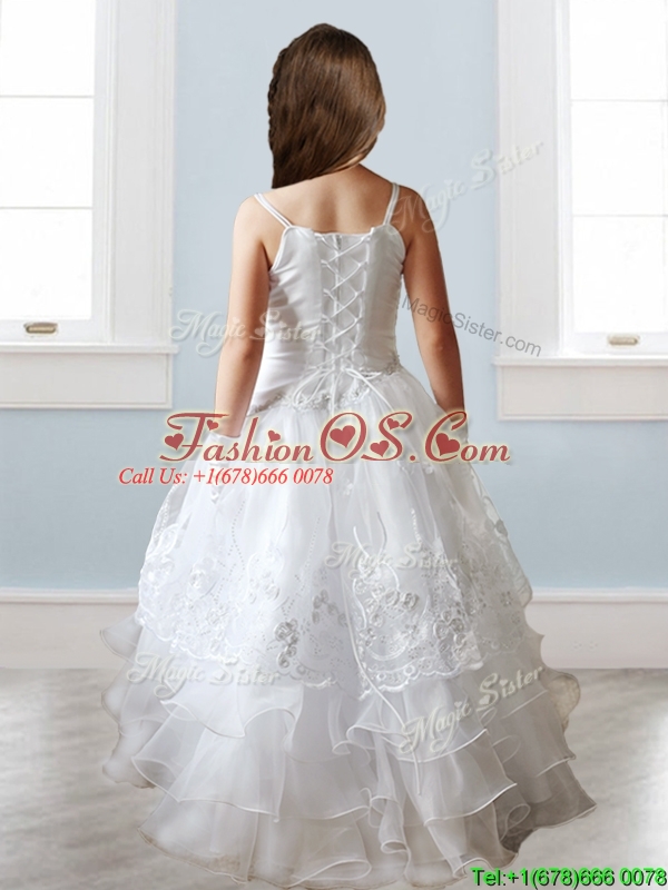 Luxurious White Spaghetti Straps Little Girl Pageant Dress with Appliques and Ruffled Layers