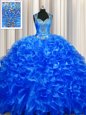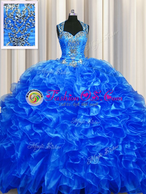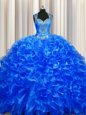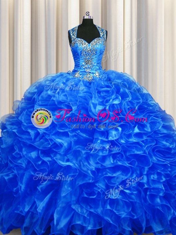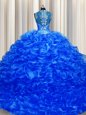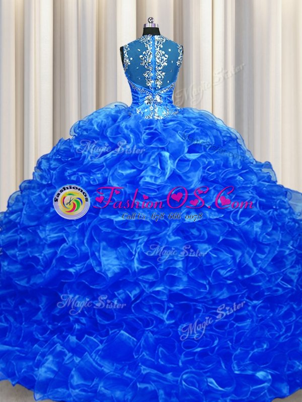 Home >  Quinceanera Dresses >  Fast Delivery Quinceanera Dresses > Luxurious Zipper Up See Through Back Sleeveless Organza With Train Sweep Train Zipper Sweet 16 Dresses in Royal Blue for with Beading and Ruffles