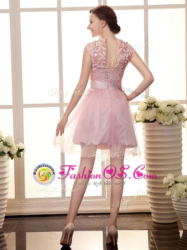Luxury Baby Pink A-line High-neck Sleeveless Chiffon Mini Length Zipper Lace Evening Dress