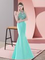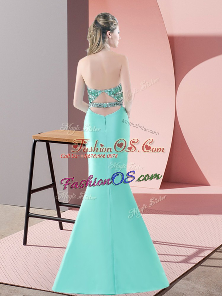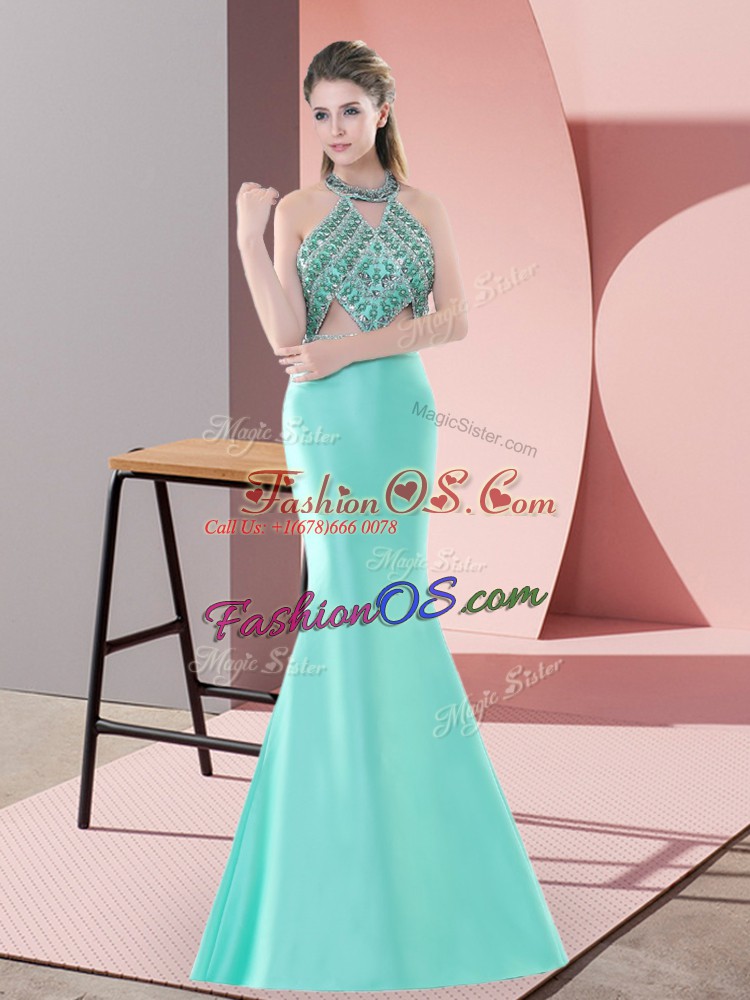 Luxury Backless Prom Dresses Blue and Apple Green for Prom and Party and Military Ball with Beading Sweep Train