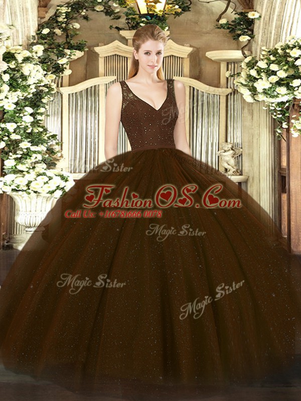 Luxury Brown Sleeveless Floor Length Beading and Lace Backless Quince Ball Gowns