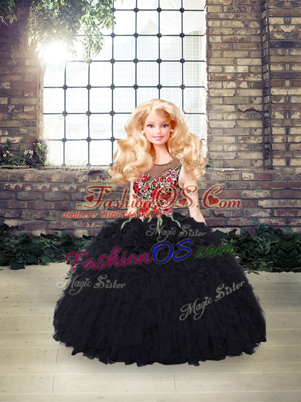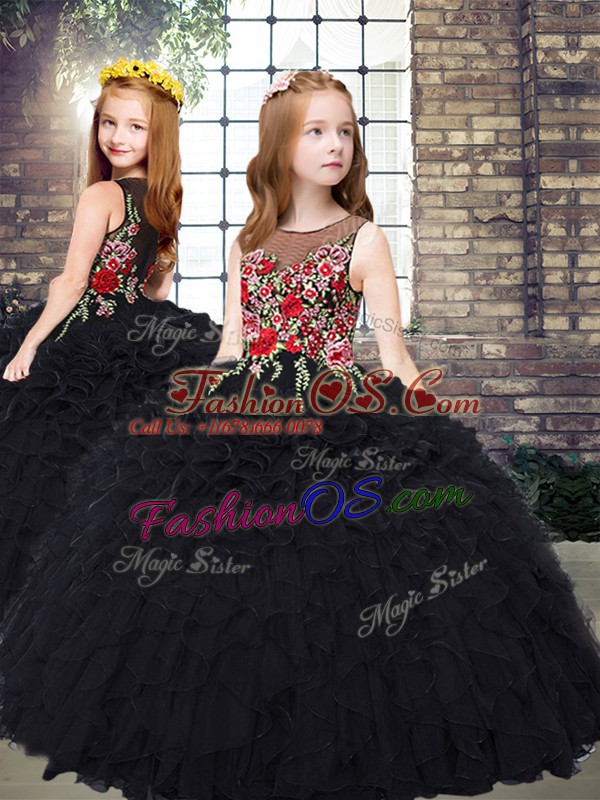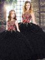 Luxury Floor Length Black 15th Birthday Dress Organza Sleeveless Embroidery and Ruffles