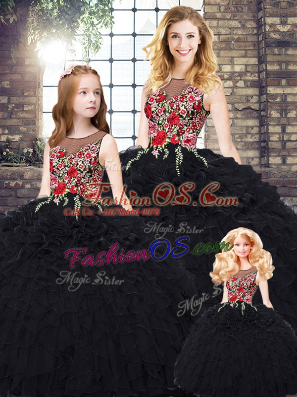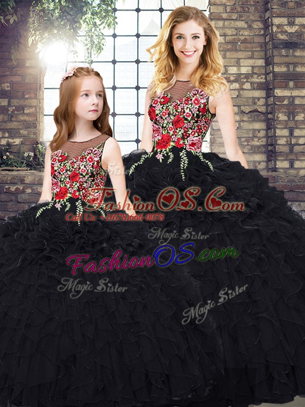 Home >  Quinceanera Dresses >  Matching Sister Quinceanera Dresses > Luxury Floor Length Black 15th Birthday Dress Organza Sleeveless Embroidery and Ruffles